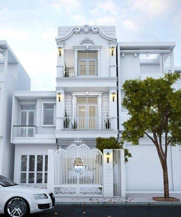 Một mẫu thiết kế khác vẫn sử dụng tone màu trắng tinh khôi là màu sắc chủ đạo. Với ý tưởng truyền tải sự đơn giản, mộc mạc nhưng vẫn sang trọng thì sắc trắng chính là sự lựa chọn hoàn hảo. Kiến trúc nhà ống 3 tầng mái bằng tưởng chừng đơn điệu nhưng nhờ họa tiết cầu kỳ ở phần đường phào chỉ của mái hiên trên cùng kết hợp với khung cửa sổ hai lớp đã thổi nét đẹp sang trọng, cổ điển vào mẫu thiết kế này.