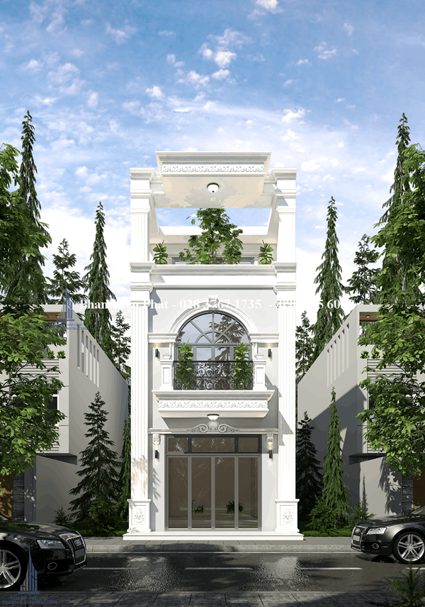 Màu trắng thực sự là màu sắc phù hợp nhất đối với thiết kế nhà đẹp mang phong cách tân cổ điển. Không có một màu sắc nào khác có thể truyền tải cái hồn của sự tinh tế, hiện đại một cách trọn vẹn hơn nữa. Một mẫu thiết kế nhà phố 3 tầng tiêu biểu với gara để xe và cửa cuốn tự động được lắp đặt ở tầng một và bên trên là các không gian sinh hoạt riêng chung khác nhau. Điểm nhấn trong thiết kế ngoại thất chính là diện tích trần của tầng 3 được trang trí cầu kỳ, nổi bật đúng với tinh thần cổ điển của phong cách thiết kế này.