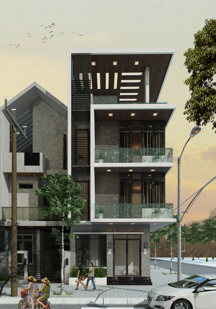 Phối cảnh của mẫu nhà phố 4 tầng này cho người nhìn thấy được một nét đẹp tổng thể bắt mắt và lung linh. Sở hữu chiều cao 4 tầng được thiết kế với mái thái giúp ngôi nhà có được cảm giác rộng rãi. Ngôi nhà không sử dụng màu sắc chủ đạo tổng thể mà thay vào đó là mỗi tầng 1 màu khác nhau, khiến ngôi nhà khác lạ và nổi bật hơn trên phố. Mặt tiền tầng 1 được thiết kế ấn tượng với cổng, hàng tào và lam chắn. Bên cạnh đó, ngôi nhà được thiết kế với không gian xanh nhờ việc bố trí tiểu cảnh hợp lý.