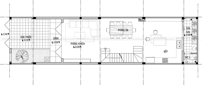 Tầng trệt được thiết kế gồm sân trước, phòng khách, phòng ăn, bếp và sân sau
