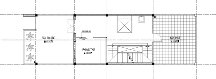 Tầng 4 là không gian của sân thượng, phòng thờ và sân phơi. Việc thiết kế sân thượng trên lầu nhằm mang lại không gian thư giãn thoải mái, hơn nữa gia chủ có thể tận dụng trồng thêm cây xanh để mang lại sự trong lành, sắp xếp những chiếc ghế nhỏ... Phòng thờ được thiết kế khép kín nhằm đảm bảo sự yên tĩnh, cửa hướng ra bên ngoài phía trước. Khu vực sân phơi thông thoáng.