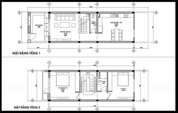 Tầng 1: bao gồm sân trước, phòng khách, ở giữa căn nhà được bố trí dãy cầu thang thông lên tầng trên, tiếp theo là toilet và phòng bếp + ăn. Việc xây dựng và sắp đặt khá đơn giản nên khiến căn nhà trở nên rộng rãi, không hề bị gò bó và chật hẹp theo yêu cầu của anh Hoàng.