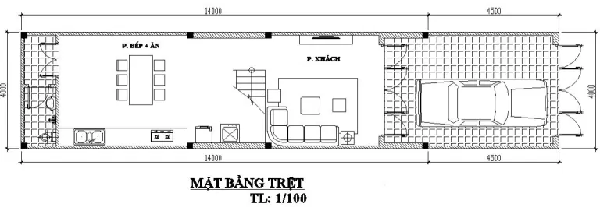 Mặt bằng tầng trệt bố trí: gara oto ngay mặt tiền ngôi nhà, sau đó 1 phòng khách, 1 phòng bếp ăn và 1 nhà vệ sinh ở vị trí cuối nhà. Khu vực cầu thang được bố trí giữa hai không gian phòng khách và phòng bếp ăn vừa tạo nên ngăn cách giữa hai khu vực. Khu vực cầu thang cũng không ngăn cách hẳn mà tạo nên khoảng không gian vừa đủ, nối liền mang để có cảm giác về sự độ sâu cho căn nhà. Gia chủ hay vị khách đến thăm nhà không có cảm nhận về một không gian nhỏ, hẹp của mẫu nhà phố hiện nay.