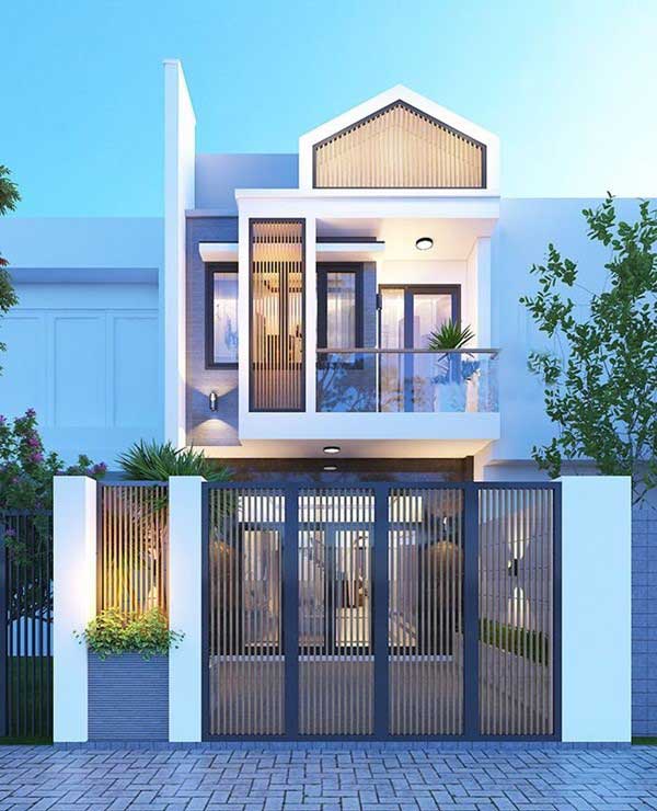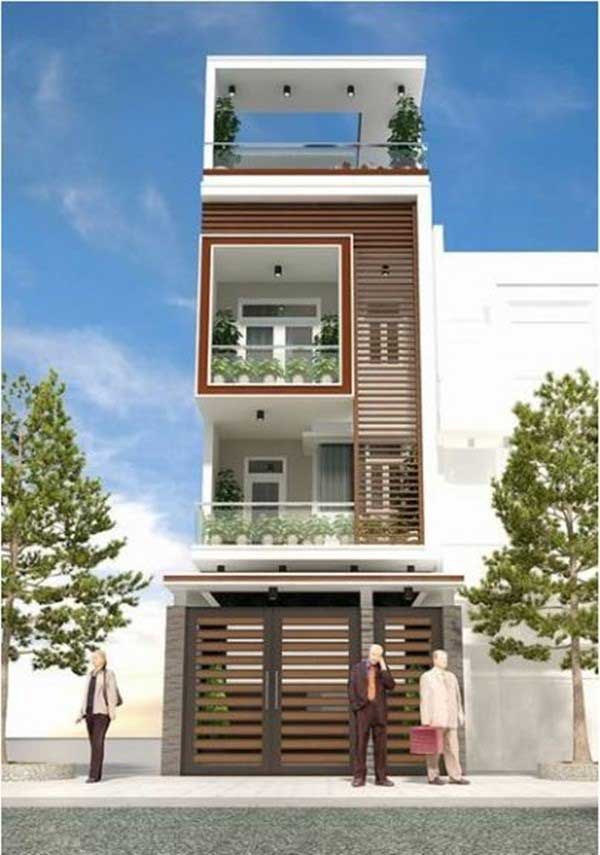 Là mẫu nhà hiện đại dành cho các cặp vợ chồng trẻ, căn nhà phố 5m sử dụng phần mái cách điệu tạo nên sự cân đối kiến trúc cho căn nhà. Hệ thống cửa được lắp đặt bằng kính cường lực cao cấp làm căn nhà trở nên sang trọng, mới mẻ. Cách thiết kế ngoại thất sử dụng dải sọc nâu bằng sắt nối từ tầng trệt lên tầng 1 và áp dụng làm cửa khiến căn nhà trở nên cá tính, độc đáo. Cách bố trí và thiết kế chỗ trồng cây cũng rất lạ mắt và sinh động, khiến căn nhà không quá khô khan mà còn rất thanh lịch và sắc xảo.