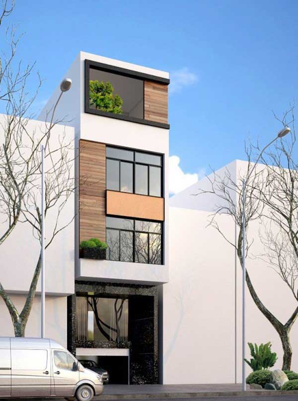 Nhằm mang tới một không gian sống tiện nghi, mẫu nhà phố 5m được thiết kế và xây dựng theo lối kiến trúc tối đa hóa được diện tích sử dụng, vì vậy mà căn nhà ống không có ban công. Nhưng bù lại có cửa sổ khá rộng và có tầm nhìn thoáng, vừa tăng được diện tích lại đảm bảo công năng sử dụng. Các lam chắn được lắp đặt bằng gỗ thể hiện lên sự mộc mạc, giản dị mà vô cùng hiện đại. Gam màu trắng nổi bật cùng mặt tiền tầng trệt được ốp đá granit màu đen tạo nên sự sang trọng, tương phản trong màu sắc, khiến căn nhà trở nên năng động và trẻ trung hơn. Ngoài ra còn được lắp đặt 1 tầng hầm để xe và phương tiện đi lại hằng ngày. Nhìn chung, mẫu nhà phố 5m được thiết kế đầy đủ công năng, rất phù hợp với các hộ gia đình hiện đại ngày nay.
