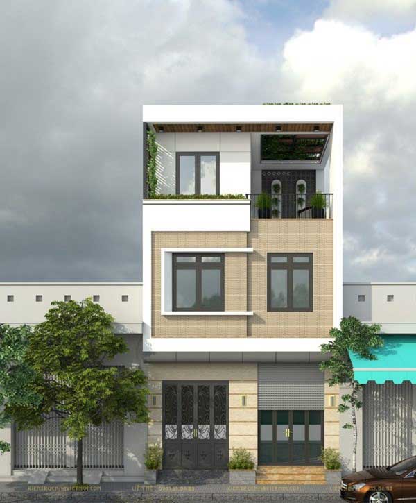 Được thiết kế kiến trúc hình khối đơn giản, căn nhà phố 5m vẫn thể hiện được sức hút có tính thẫm mỹ cao đến các chủ hộ đầu tư hiện nay. Mặt tiền được xây dựng tối giản nhưng rất hiện đại, đảm bảo được độ thông thoáng và tiện nghi. Thiết kế mặt tiền ở tầng trệt chạy thẳng lên tầng thượng, được xây dựng một khối đua có độ rộng bằng nhau, cùng thiết kế khối C ở tầng 2 và 3 đã tạo nên sự sang trọng và sắc xảo cho căn nhà. Việc ốp tường bằng lam nhựa làm tăng thêm tính thẫm mỹ cho căn nhà, mà giá thành lại đảm bảo và tiết kiệm được chi phí. Thiết kế hệ thống cửa kính cùng lam nhôm chắc chắn, cùng khối lệch và lan can kính kết hợp cùng gam màu ngoại thất, trần được ốp lam nhựa 3D giúp căn nhà trở nên hiện đại, sang trọng và bắt mắt hơn. Để tận dụng ánh sáng tự nhiên, căn nhà được lắp đặt thiết kế hệ thống cửa nhôm xingfa màu nâu đen, chạy cùng với thiết kế làm màu vân gỗ sáng, giúp cân bằng hiệu ứng ánh sáng và không gian thiết kế kiến trúc. Là mẫu nhà hot đang được các chủ hộ đầu tư nhiều hiện nay.