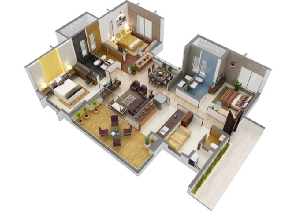 Mặt sàn 7x12m được chia thành hai diện tích song song với nhau. Trước khi bước vào phòng khách sẽ phải đi qua bậc tam cấp, sảnh chính rồi mới đến không gian phòng khách, đối diện phòng khách sẽ là phòng ngủ đầu tiên của gia đình. Tại không gian phòng khách cần rất nhiều ánh sáng cũng như không khí nên bố trí thêm hệ thống cửa 2 cánh và phần sảnh phủ cùng hệ thống bậc tam cấp phía bên. Phòng khách của căn nhà này nối liền với khu vực phòng ăn, đối diện phòng ăn là nhà vệ sinh và khu vực cầu thang. Phòng khách và khu vực bàn ăn được nối thông để tạo ra không gian rộng rãi, thông thoáng cho gia chủ sử dụng. Tiếp theo là khu vực bếp, đối diện là phòng ngủ số 2. Ngay sau phòng ngủ số 2 là phòng ngủ số 3 của gia chủ. Phòng ngủ thứ nhất và thứ hai sẽ có chung nhau là nhà vệ sinh cạnh cầu thang. Từ bếp có lối dẫn ra sân sau nhà, tại đây gia chủ bố trí thêm một nhà vệ sinh thuận tiện kết hợp nơi giặt và phơi đồ.