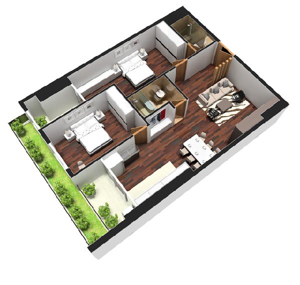 Với mẫu nhà phố 7x12m quy mô xây dựng 1 tầng, gia chủ có thể bố trí 2 phòng ngủ như lát cắt bên trên để không gian khác có được diện tích lớn hơn cho gia chủ sử dụng.