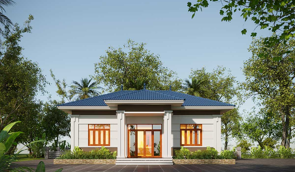 Một mẫu thiết kế dành cho mẫu nhà phố 7x12m với quy mô 1 tầng được chú ý rất nhiều với thiết kế đơn giản so với mẫu nhà được đề cập đến bên trên. Mặt tiền hiện lên với mảng tường trắng cùng với lớp phớ đơn giản để tránh gây nhầm chán. Cửa kính với hai cột trụ vững chắc kết hợp với kiến trúc mái bên trên hiện lên kiến trúc nhà Pháp sang trọng. Hệ thống cửa chính và cửa sổ lựa chọn khung gỗ cửa kính sang trọng, phù hợp với tổng thể kiến trúc sang trọng cổ điển của căn nhà. Chậu cây xanh được thiết kế bên dưới khung cửa, ốp đá sang trọng tạo nên không gian xanh cho ngôi nhà.