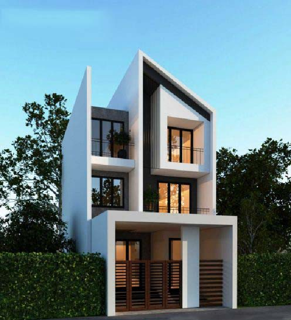 Mẫu nhà phố 7x12m với quy mô xây dựng 3 tầng, lựa chọn phong cách thiết kế hiện đại với khối hộp được sử dụng để tối đa hết diện tích ở của gia chủ. Mẫu thiết kế này lựa chọn tone màu trắng nhã nhẵn, phù hợp với khu vực thành phố. Trên nền trắng ấy, gia chủ lựa chọn khung sơn màu gỗ vô cùng nổi bật, ấn tượng. Mặt tiền tầng 1 được bao bọc chắc chắn bởi hệ thống tường rào với khung được sơn giả màu gỗ vô cùng sang trọng. Lên đến tầng 2 ban công lựa chọn chất liệu bằng kính cường lực chắc chắn, bên ngoài là thiết kế để trồng cây xanh mang đến không gian thiên nhiên cho khu vực ban công nhà. Chú ý đến phần cửa sổ ở tầng 2 được thiết kế tràn hai mặt của ngôi nhà để gia chủ sử dụng diện tích bên trong có cảm giác về không gian mở, rộng hơn diện tích thực tế. Lên đến tầng 3, ban công thu hẹp lại, thay vì chất liệu kính thì sử dụng chất liệu bằng gạch xi măng chắc chắn, bố trí thêm tiểu cảnh cây để có không gian xanh trong ngôi nhà.