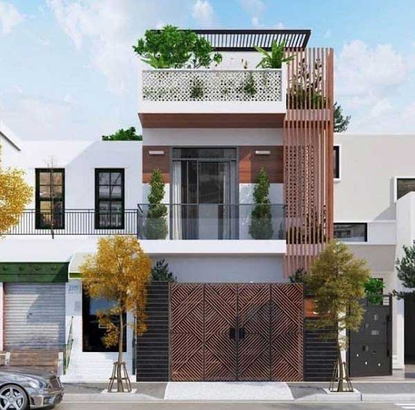 Thiết kế đầu tiên chúng tôi muốn giới thiệu với bạn đọc là 1 mẫu nhà phố 7x9m 3 tầng rộng rãi và bắt mắt. Điểm nổi bật đầu tiên chúng ta thấy ở đây là ở hệ thống cửa vào được sử dụng chất liệu bằng sắt cao cấp được điêu khắc hoa văn tinh xảo và tỉ mỉ. Phần song cửa chắn ở rìa phải gây hiệu ứng tò mò cho người nhìn đồng thời cũng phối màu rất cân xứng với màu cửa và gỗ của căn nhà. Lầu 3 được bài trí rất khác biệt. Nếu như ở tầng 2 gia chủ chú ý dùng chất liệu kính chắc chắn và sang trọng làm hàng lan can thì lầu cao nhất được sử dụng chất liệu gạch trắng điêu khắc dạng lưới tôn thêm vẻ mỹ lệ và xinh đẹp cho khu vườn.