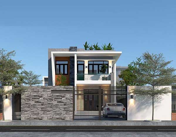 Mẫu thiết kế nhà tiếp theo là 1 thiết kế mẫu nhà phố 7x9m đậm chất hiện đại với tông màu trắng kem sữa làm chủ đạo. Hệ thống mái được xây dựng rất mới mẻ với mái nhà xếp chồng. Phần tường bao ở mặt tiền tầng 2 ngôi nhà không những không tạp sự bí bách mà còn gợi ra 1 không gian rộng rãi, khoáng đạt hơn xong vẫn đảm bảo sự riêng tư cần thiết của chủ nhà. Xung quanh nhà được bài trí rất nhiều cây xanh cho cuộc sống trong lành và thư thái hơn rất nhiều.