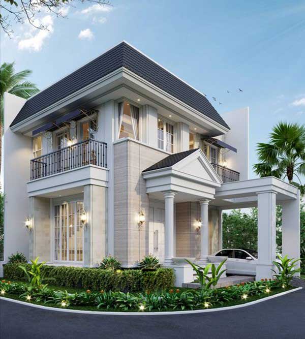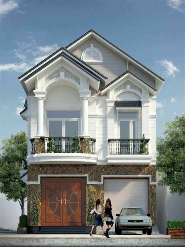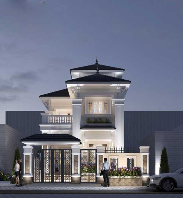 Một tòa lâu đài lộng lẫy, sang trọng và cao cấp chắc chắn là mơ ước của nhiều người. Nó hoàn toàn phù hợp với diện tích 9x15m mà bạn đang có, một ngôi nhà được thiết kế theo phong cách hiện đại kết hợp với tân cổ điển. Gam màu trắng tinh tế tượng trưng cho vẻ đẹp cao quý và sang trọng. Toàn bộ ngôi nhà đều sử dụng cột chống với những họa tiết trang trí đẹp mắt, kết hợp với hệ thống ánh sáng sẽ khiến cho không gian trở nên đẹp hơn vào ban đêm.