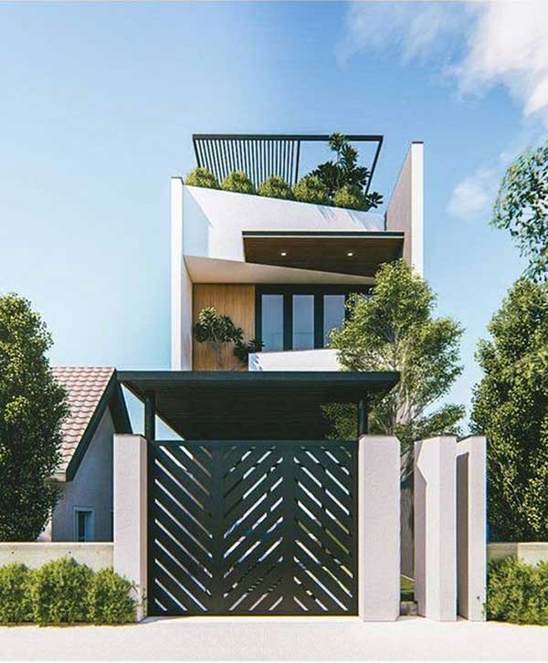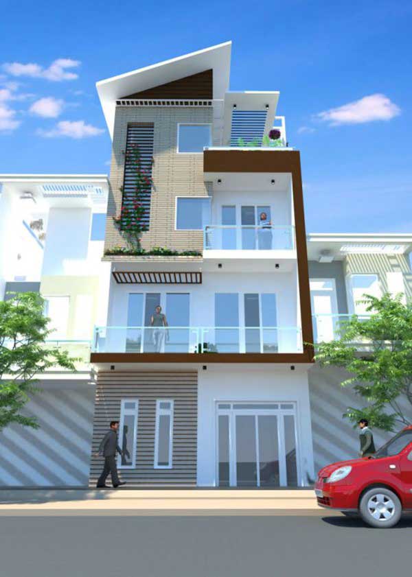 Đây là một trong những mẫu nhà phố mà bạn sẽ thường xuyên gặp ở các thành phố lớn, nơi được miêu tả với cụm từ “đất chật, người đông”. Và để có thể đáp ứng được nhu cầu sử dụng của nhiều người thì phương pháp duy nhất là xây dựng nhà nhiều tầng. Mặc dù vậy, kiến trúc của ngôi nhà cũng không khiến chúng ta có cảm giác nặng nề và cồng kềnh. Các đường nét, màu sắc phối hợp với nhau vô cùng hài hòa, đảm bảo mang đến cho bạn một không gian sống đẹp và thu hút.