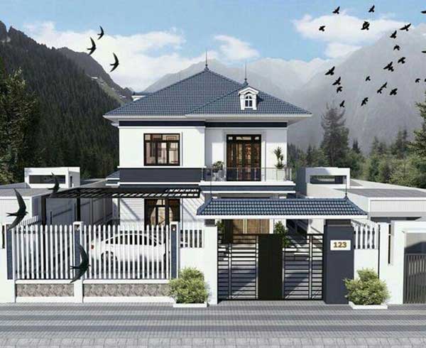 Rộng rãi, phóng khoáng, kết hợp giữa kiến trúc hiện đại và truyền thống để tạo nên một không gian sống đẹp. Bản vẽ này sử dụng gam màu trắng – xanh tạo cảm giác sang trọng và cao cấp vô cùng. Khoảng sân rộng rãi phía trước có thể để ô tô hoặc tổ chức một bữa tiệc ngoài trời cũng vô cùng phù hợp.