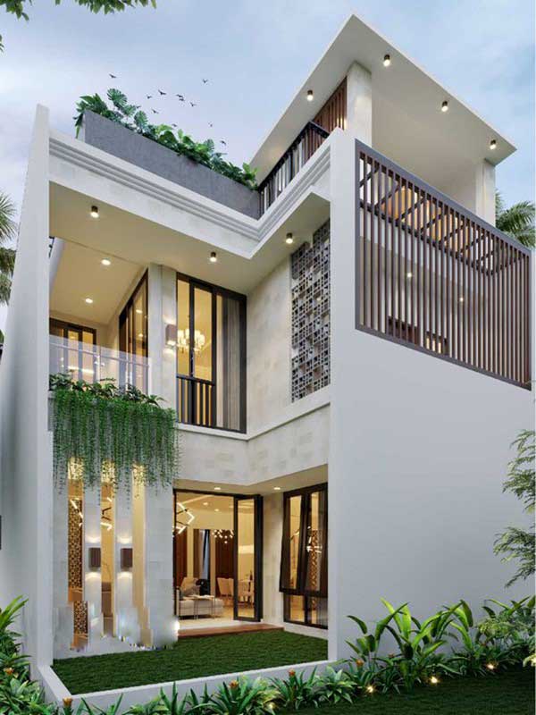 Đẹp và ấn tượng, đây chắc chắn sẽ là mẫu nhà phố 9x15m mà bạn có thể lựa chọn cho cuộc sống lâu dài của mình. Thiết kế hai tầng theo dạng hình hộp với những đường nét kiến trúc đơn giản vừa đảm bảo yếu tố nghệ thuật, vừa tiết kiệm chi phí một cách hiệu quả. Sử dụng cửa kính trong không gian mang đến cho ngôi nhà vẻ đẹp hiện đại, đồng thời sẽ giúp cho ngôi nhà trở nên sáng và rộng hơn. Thêm một vài chiêc bòng đèn bên ngoài ngôi nhà sẽ khiến chúng trở nên nổi bật về đêm.