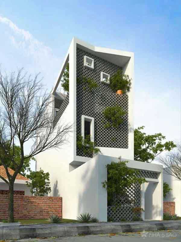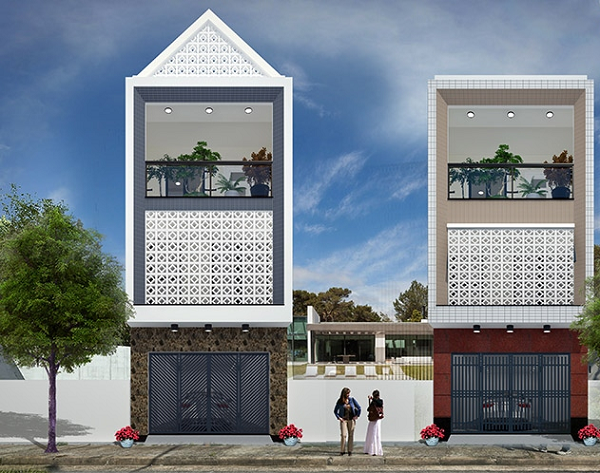 Một số mẫu thiết kế nhà dạng này thực sự táo báo hơn khi sơn xanh khung cửa sắt để tạo điểm nhấn nổi bật trên nền trắng của thanh lam che nắng. Nếu như không thích sắc trắng nổi bật ở hai mẫu trên thì mẫu thứ 3 với gam màu trầm lắng với gam màu trầm, sậm mang đến cảm giác sang trọng nhưng có phần trầm lắng.