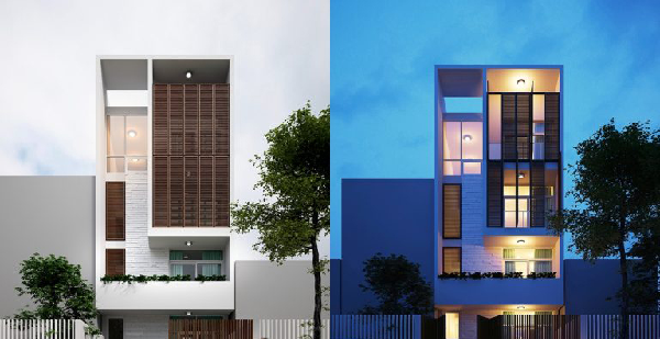 Hệ lam che nắng làm bằng gỗ Conwood giúp điều chỉnh theo thời gian chiếu sáng trong ngày. Màu nâu của gỗ kết hợp tone màu chủ đạo trắng giúp ngôi nhà không chỉ mang vẻ đẹp hiện đại mà còn hơi hướng cổ điển. Ngôi nhà kiểu này cũng có điểm nhấn mạnh hơn khi sử dụng khối hộp tránh sự nhầm chán trong khuôn viên nhà phố đẹp hiện nay. Việc sử dụng khối hộp đầy sáng tạo phá vỡ thị giác về từng tầng trong xây nhà truyền thống.