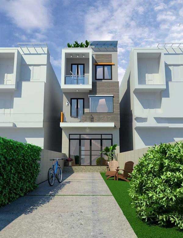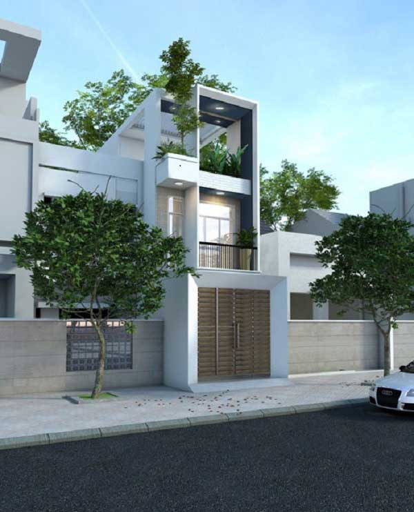 Mẫu nhà này đem đến cho người xem một cảm giác yên bình khi nhìn thấy, được thiêt kế theo phong cách nhà ống gồm có 3 tầng. Nhà thiết kế đã sử dụng gam màu trắng làm chủ đạo kết hợp với những cây xanh ở ban công và sân thượng tạo cảm giác mới mẻ và tươi mát cho ngôi nhà của mình. Nhìn từ xa, ngôi nhà rợp bóng cây mát, đây thật sự là một ý tưởng xây dựng độc đáo cho gia đình của bạn.