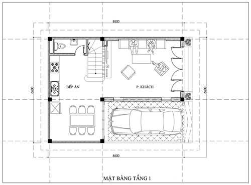 • Tầng 1: Sân để xe, phòng khách, phòng bếp ăn, phòng wc.