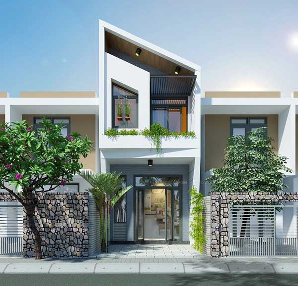 Một ngôi nhà với phần mái lệch kép tạo nên sự độc đáo và mới lạ hơn. Tổng thể ngôi nhà khá đơn giản, các chi tiết được thiết kế không rườm rà, rối mắt nhưng lại tạo cảm giác rộng rãi. Ngôi nhà có nhiều mặt đón nắng cùng ban công hai phía nên thông thoáng hơn. Điểm cộng cho ngôi nhà chính là phần bậc thềm, giúp sđẩy ngôi nhà cap hơn và kiên cố hơn.