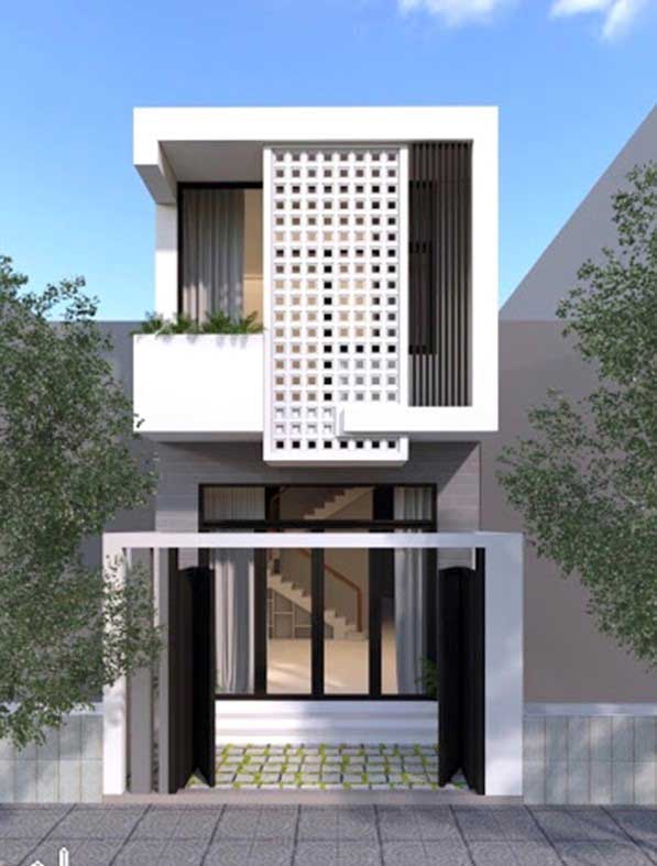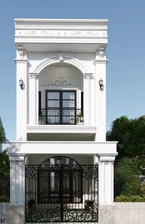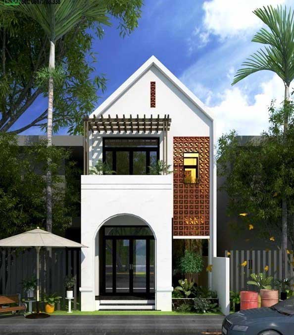 Một ngôi nhà với diện tích mặt tiền từ 4-5 m, thiết kế 2 tầng cùng phần mái ngói nhọn và các cột trụ cao lớn khiến ngôi nhà cao hơn. Sự kết hợp giữa tông màu trắng cùng các màu nâu trầm khiến ngôi nhà ấm áp hơn. Cửa ra vào được thiết kế vừa phải kết hợp thêm 1 cửa sổ nhỏ nên tận dụng tối đa ánh sáng tự nhiên. Phần ban công rộng rãi trên tầng 2 là điểm cộng cho không gian thư giãn của ngôi nhà.