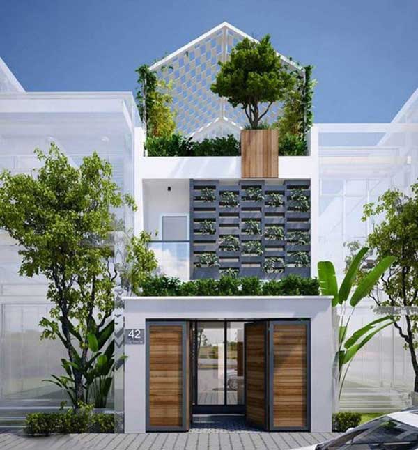 Thiết kế theo phong cách hiện đại cùng tông màu tắng nổi bật là ưu điểm đầu tiên của ngôi nhà. tầng 1 được thiết kế đơn giản, không cầu kì nên cảm giác chiều ngang như mở rộng thêm, các ô xen kẽ trên tầng 2 như tạo điểm nhấn thêm cho ngôi nhà. Do diện tích hạn chế nên kiến trúc sư khéo léo kết hợp thêm tầng thượng để tạo điều kiện cho gia đình có thể sử dụng trồng hoa, cây xanh tùy ý. Điểm cộng cho ngôi nhà chính là tận dụng mọi diện tích để bày trí cây xanh cho ngôi nhà.