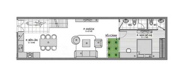 Nhà cấp 4 có gác lửng 5 × 20 và giếng trời.