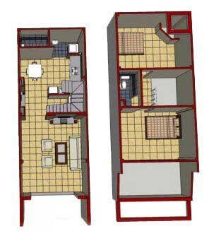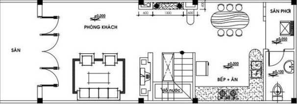 Nó giúp tiết kiệm diện tích của ngôi nhà, nhưng vẫn đầy đủ các tính năng cần thiết. Phòng khách ở sảnh chính. Cầu thang được bố trí công phu giúp ngôi nhà không bị che khuất bởi khu vực sinh hoạt. Tiếp đến là phòng bếp với bàn ăn nhỏ. Cuối nhà có nhà vệ sinh và phòng phơi đồ của gia đình.