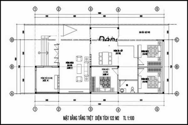 Công năng sử dụng của tầng trệt như sau: phòng khách, phòng thờ, phòng bếp + ăn, 3 phòng ngủ, 1 vệ sinh chung.