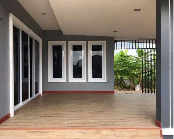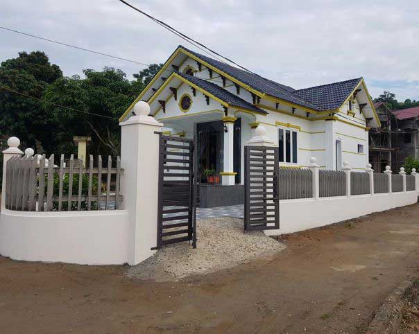 Ba bậc tam cấp dẫn vào phòng tiếp khách, 2 bên là 2 chậu cây nhỏ. Sàn đá granit đen che phủ các vết bẩn và dễ dàng lau chùi. Chân tường được ốp gạch nâu để chống rêu, mốc. Cửa chính và cửa sổ được làm bằng khung nhôm đen và kính cường lực. Về phần hệ thống mái thái, mẫu nhà cấp 4 được trang bị mái bằng và bên trên là khung sắt lợp ngói đơn giản. Trong công trình thiết kế nhà đẹp tuyệt vời này, kiến trúc sư sử dụng mái tôn lạnh màu xanh sáng với các đợt vuông. Điều này sẽ làm giảm khả năng hấp thụ nhiệt, giúp không gian bên trong luôn thoáng mát. Màu sắc ngoại thất trên được làm nổi bật trên nền tường trắng chủ đạo. Cửa chớp là mái bằng để ngăn nước mưa tạt vào cửa. Ngôi nhà cấp 4 mái tôn với kiến trúc đơn giản, không hoa lá, không hoa văn trang trí; Nhưng vẫn mang một vẻ đẹp giản dị. Tái hiện cuộc sống yên bình nơi thôn quê xanh mát.