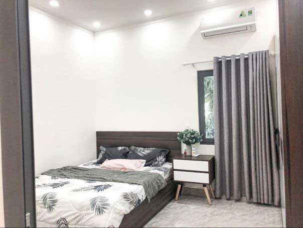 Nội thất phòng ngủ đơn giản, hiện đại tạo không gian riêng tư, gần gũi và thân thiện. Giường ngủ được bố trí ngay sát tường với điểm nhấn là chiếc kệ nhỏ đầu giường. Tủ quần áo phòng ngủ bằng nhựa, với tông màu phù hợp giúp không gian phòng ngủ trở nên rộng rãi và thoáng mát hơn.