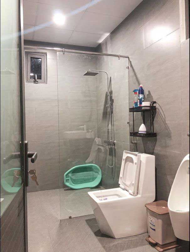 Thiết kế nhà vệ sinh với đầy đủ nội thất và phụ kiện. Phòng bé với gam màu hồng nhạt và trắng xám, đẹp mắt, tạo không gian nghỉ ngơi, vui chơi cho bé.