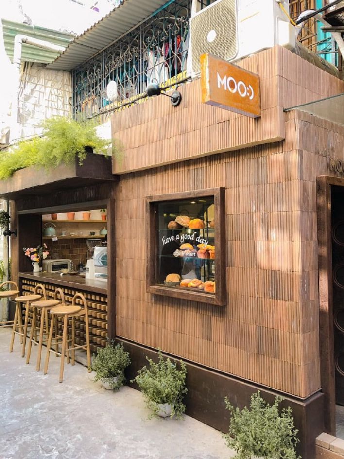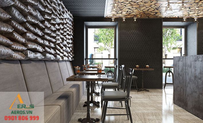 Còn phần trần quán cafe được thiết kế với chất liệu gỗ tạo nét đặc trưng cho quán. Đồng thời, đây cũng là điểm nhấn nổi bật trong thiết kế. Về phía mặt tiền, việc bố trí xen kẽ giữa bàn được bắt trực tiếp vào tường cạnh cửa sổ cùng ghế cao cùng với bàn nhỏ và ghế bình thường giúp quán có không gian hơn.
