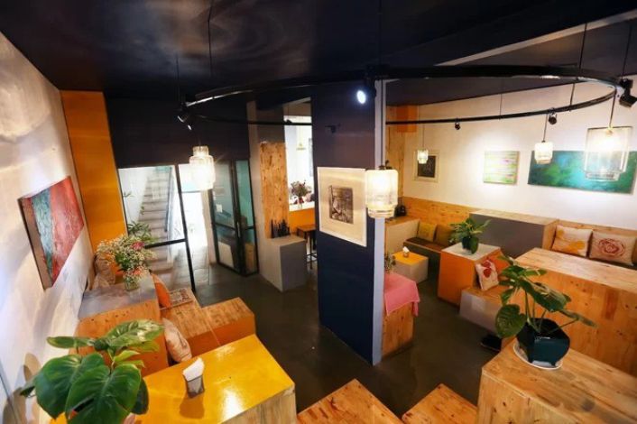 Hệ thống trần nhà được đan xen từ các thanh gỗ Pallet hết sức tinh tế mà chỉ có sự tính toán kĩ lưỡng mới tạo nên được không gian quán đẹp như thế. Hệ thống chiếu sáng với gam màu vàng giúp đánh bật lên màu gỗ mà còn tạo nên sự quen thuộc gần gũi trong hình thức trang trí.