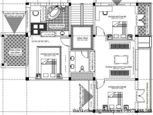 Mặt bằng tầng 2 sẽ bao gồm 3 phòng ngủ và 1 phòng sinh hoạt chung cho cả gia đình. 1 phòng vệ sinh riêng sẽ được bố trí trong phòng ngủ của bố mẹ, 2 phòng ngủ dành cho con cái còn lại sẽ dùng chung một phòng vệ sinh riêng.