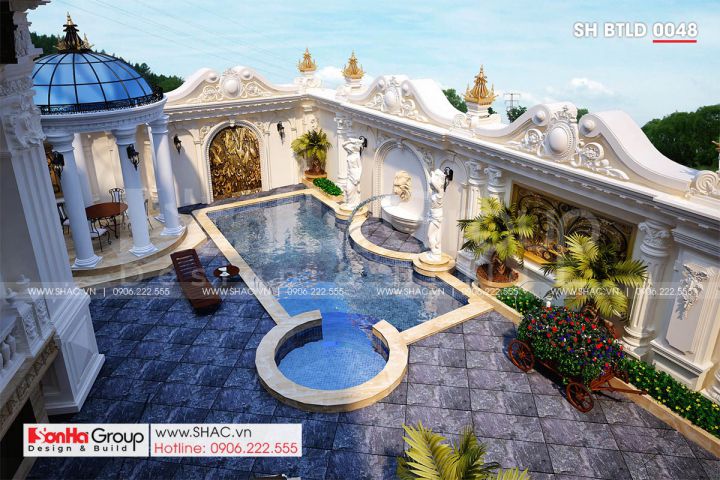 Điểm nhấn của căn biệt thự không chỉ nằm ở vẻ bề ngoài hào nhoáng mà nó còn nằm ở việc bố trí hài hòa giữa không gian dành cho nhà ở và không gian sân vườn cũng như không gian dành cho bể bơi. Không gian sân vườn được chú ý tỉ mỉ đến từng góc nhỏ. Hệ thống bồn hoa, cây cảnh được thiết kế độc đáo, khác biệt. Hồ bơi cũng được chú ý, trang trí tỉ mỉ từ cách thiết kế đến trang trí. Xung quanh phần miệng hồ được chạm trổ tinh tế. Phần lòng hồ sử dụng loại đá cao cấp, biến hồ bơi thành một chiếc gương phản chiếu ánh sáng, mang đến không gian lung linh mỗi khi nắng lên hoặc đêm về.