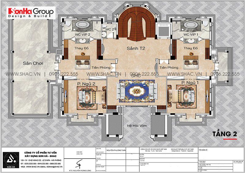 Tầng 2 được thiết kế với 2 phòng ngủ rộng lớn để đáp ứng tối đa nhu cầu sinh hoạt của các thành viên. Trong mỗi phòng ngủ là sự sắp đặt nội thất theo đúng kiến trúc cổ điển với chiếc giường ngủ rộng lớn, cùng với phòng thay đồ, phòng treo đồ, nhà tắm VIP mang đến trải nghiệm về một cuộc sông vương giả, thượng lưu.
