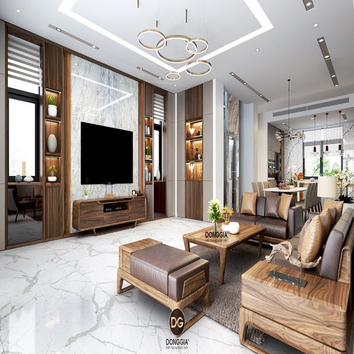 Sự kết hợp màu sắc hài hòa cho sản phẩm là một tiêu điểm của nhà thiết kế nội thất, khi sử dụng màu sắc vân gỗ trên nền gạch trắng càng tôn nên gia strij của nội thất cũng như vẻ đẹp vân gỗ tự nhiên. Nội thất trong phòng khách không chỉ có bàn ghế và còn kệ tủ tivi hay tủ trang trí đều được gia công từ nguyên liệu gỗ óc chó. Đây là nguyên liệu chính tạo nên nội thất đẹp sang trọng cho nhà 3 tầng giá 800 triệu.