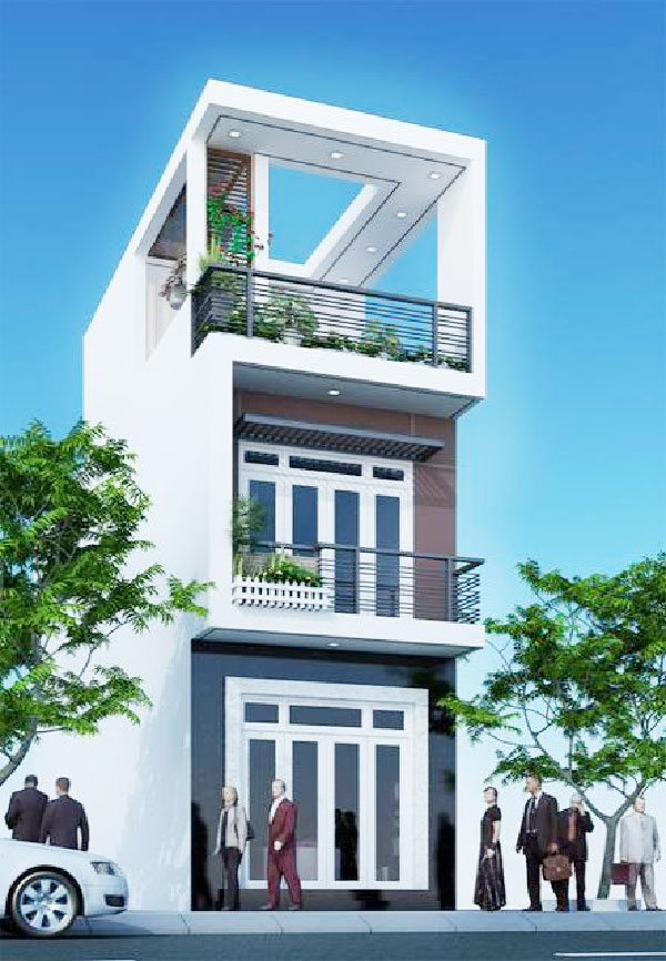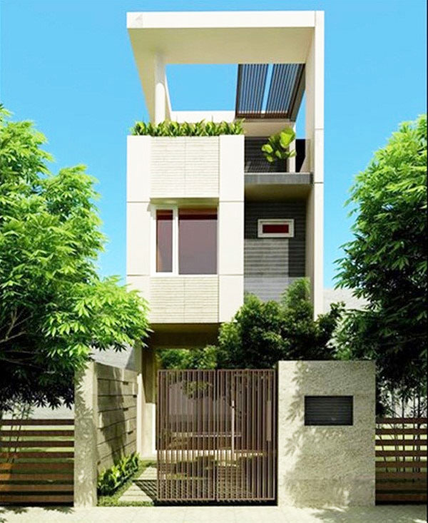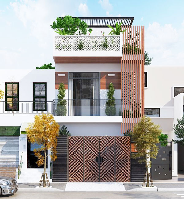 Theo đuổi phong cách hiện đại với ngôi nhà 1 trệt 1 lầu 1 tum, kiến trúc này áp dụng cho căn nhà mặt tiền rộng hơn, từ 6m đổ lên. Căn nhà này ấn tượng bởi hệ thống thanh lam được nối dài từ tầng 3 xuống đến tầng 2. Không chỉ có tác dụng tránh nóng, những thanh lam nay mang đến hiệu quả về mặt thẩm mỹ khi mang đến những đường nét khỏe khoắn cho ngôi nhà, phá đi sự quen thuộc của những ngôi nhà có mặt tiền liền kề hiện nay.