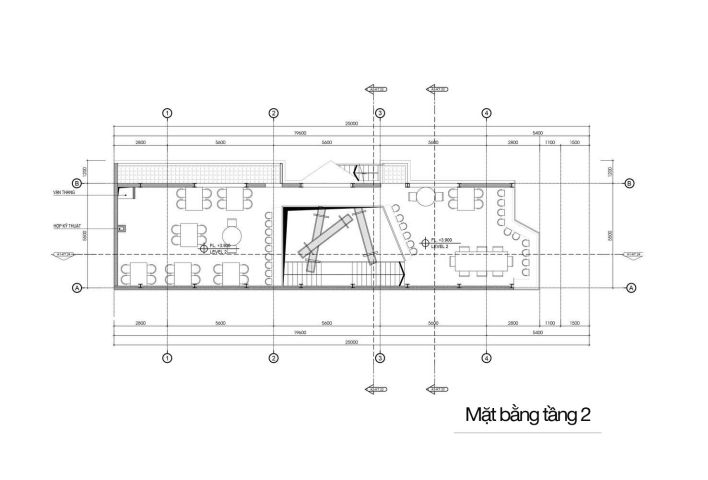 Nhìn vào bản vẽ này, chúng ta có thể thấy tầng 1 được thiết kế bao gồm không gian bên trong và bên ngoài với nội thất phù hợp. Ngoài ra còn có khu vực của quầy bar, cây xanh với nhằm mang đến không gian tươi mới và làm dịu nhẹ sự thô cứng của công trình. Hơn nữa, cầu thang được thiết kế bằng hệ khung thép vững chắc.