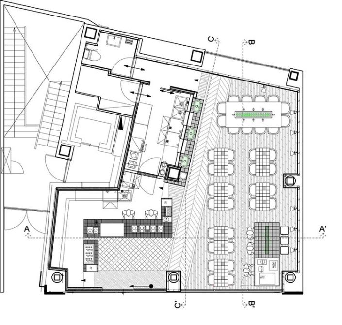 Khu vực dành cho khách hàng được đặt dọc hành lang đi lại với thiết kế bàn dài kết hợp ghế sofa. Tại vị trí này các khách hàng có thể vừa thưởng thức đồ uống, vừa ngắm cảnh bên ngoài qua khung cửa kính. Sâu vào bên trong quán, là những bộ bàn ghế được đặt sát tường với hướng nhìn ra bên ngoài. Thế kế kiểu bàn đôi và tạo khoảng cách thoải mái cho khách hàng đi lại. Hơn nữa, khách hàng có thể chọn lựa nhiều góc, vị trí ngồi khác nhau để quan ngắm cảnh.