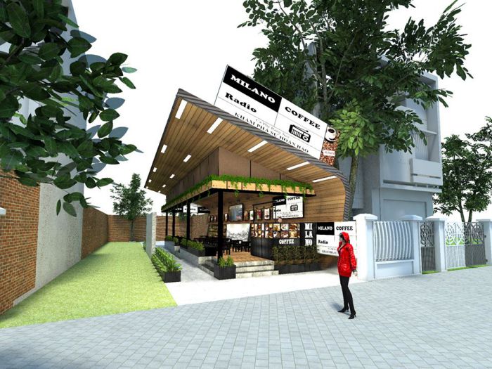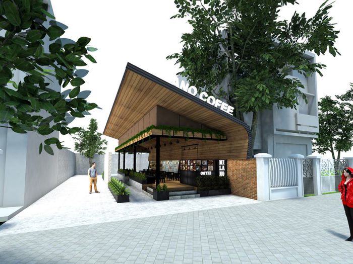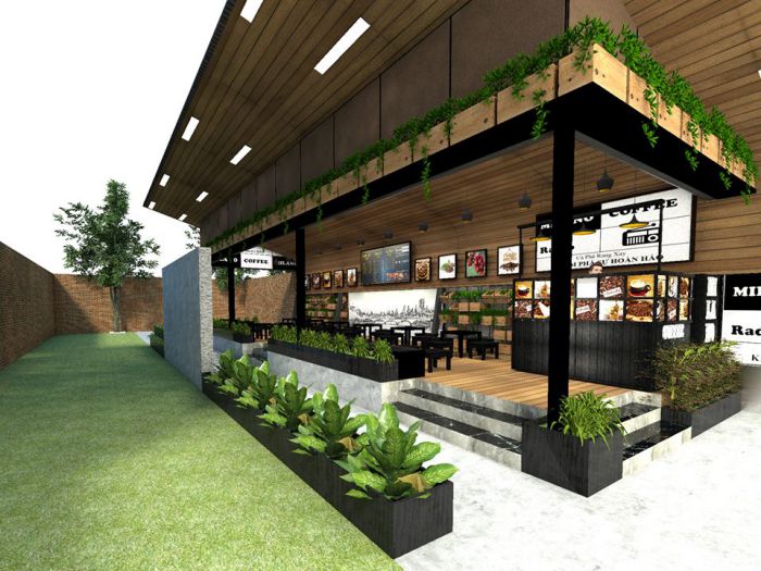 Không gian quán được nằm trên mảnh đất có diện tích hơn 400m2 với yêu cầu của chủ quán cần khoảng 80m2 làm cafe trong nhà, còn lại là sân vườn. Do có lợi thế tốt nằm ngay góc ngã tư đường trong khu đô thị nên đội ngũ kiến trúc sư đã tận dụng để thiết kế quán thành 2 lối đi chính và phụ nhằm giảm lượng người trên mỗi lối đi. Điểm ấn tượng của mẫu thiết kế này là lối đi chính, sau khi đi qua cổng được thiết kế giản dị đẹp mắt thì chúng ta sẽ bắt gặp lối đi từng bậc đá trên hồ nước cực cuốn hút.