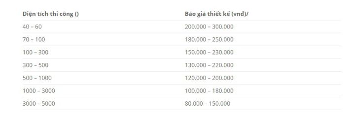Giá thiết kế quán cafe sẽ phụ thuộc vào nhiều yếu tố khác nhau, cũng như đơn vị thi công thiết kế mà chủ đầu tư lựa chọn. Bởi mỗi đơn vị sẽ có mức chi phí khác nhau, sau đây là bảng báo giá thiết kế dựa trên diện tích mà Xây Dựng số đã tham khảo và tổng hợp lại, bạn có thể tham khảo thêm: