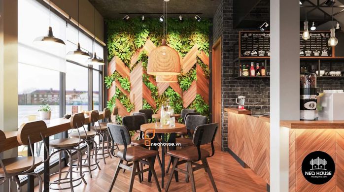 Bên cạnh quầy pha chế là không gian dùng để bàn ghế với mục đích phục vụ khách hàng cũng như tận dụng được tối đa diện tích. Phía tường được các kiến trúc sư thay thế bằng hàng cây áp tường nhằm giảm nhiệt cũng như tạo điểm nhấn cho không gian bên cạnh quầy. Phần chính giữa tạo cảm giác hiện đại với các bức tranh, ảnh mang phong cách hiện đại, sự kết hợp với những hàng ghế dài còn giúp tiết kiệm diện tích cũng như tạo rộng, phù hợp với nhóm khách hàng đông đúc. Không gian tầng trệt tập trung vào sợ đơn giản cùng không khí trong lành, cách trang trí quán cafe ngoài trời được lược bớt thêm vào đó là đèn chùm tạo sự lãng mãn và ấm cũng giúp khách hàng có không gian trò chuyện bên gia đình, người thân.