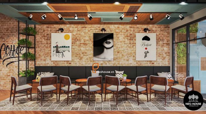 Đây cũng là mẫu thiết kế quán cafe đẹp mà bạn có thể tham khảo. Quán được thiết kế với gam màu gỗ kết hợp với tranh ảnh nhằm thể hiện sự ấm cúng, hiện đại. Tông màu này cũng được nhiều chủ kinh doanh lựa chọn khi thiết kế quán cafe. Chính sự kết hợp hài hòa giữa ánh sáng và màu gỗ đã khiến khách hàng cảm thấy thoải mái khi đến đây.