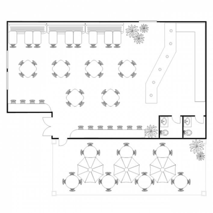 Trong bản thiết kế mặt bằng quán cafe 100m2 sân vườn này bạn sẽ thấy diện tích quán được chia làm 2 khu vực đó là không gian ngoài trời và trong nhà. Với diện tích trong nhà, các kiến trúc sư đã cân đối trong việc sắp xếp khu vực dành cho khách, cho nhân viên và khu vệ sinh. Từ cửa chính đi vào sảnh sẽ hướng đến quầy phục vụ. Quầy phục vụ được bố trí tại đây sẽ giúp không gian quán gọn gàng và thuận tiện cho việc oder đồ uống.
