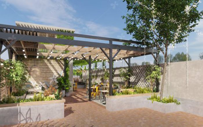 Trong trang trí quán phong cách cafe sân vườn thì không thể thiếu cây xanh. Vì vậy, đơn vị thiết kế đã sử dụng mái che kết hợp ô khi cần thiết để che nắng cũng như mang đến không gian xanh cho quán. Cây xanh được trồng xen kẽ với nhiều loại nhằm mang đến đúng chất cafe phong cách sân vườn. Có thể thấy, quán cafe 100m2 sân vườn tuy đơn giản nhưng vẫn đảm bảo về kỹ thuật cũng như các yếu tố kiến trúc đã mang đến sự hài lòng cho chủ kinh doanh.
