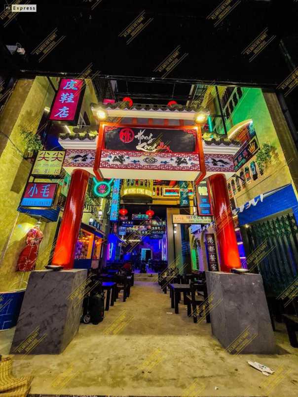Đầu tiên, không gian quán cafe HongKong được thiết kế ấn tượng với hệ thống đèn ladd Neon và bảng hiệu. Một không gian quán cafe được thiết kế như một hẻm phố thu nhỏ với những bảng đèn, biển hiệu lấp lánh. Điểm nổi bật thứ 2 là thiết kế quầy bar mang phong cách cổ xưa và hiện đại. Những chiếc đèn có màu sắc vàng trầm ấm nhằm mang lại không gian nổi bật, mỗi bàn có một khoảng cách để tạo sự riêng tư. Ngoài ra, phần gạch ốp tường độc đáo cũng mang đến một phần sang trong cho không gian quán.