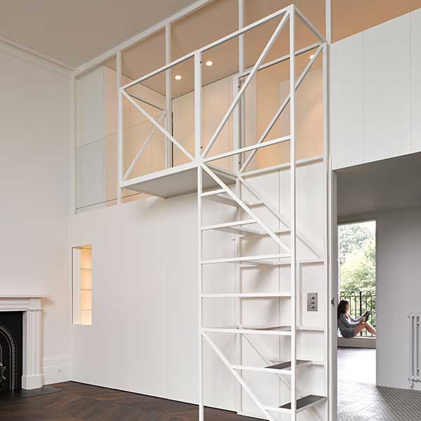 Giống như một khối rubic khổng lồ, mẫu cầu thang cho nhà nhỏ hẹp này hoàn toàn phù hợp với những người yêu thích sự sáng tạo, liên tưởng và hình khối. Sử dụng gam màu trắng đồng nhất với không gian mang lại cảm giác rộng hơn cho ngôi nhà. Chất liệu sử dụng cho cầu thang bằng kim loại vô cùng chắc chắn, cùng với những họa tiết đơn giản, nhưng gắn kết với nhau tạo thành một kết cấu đẹp và ấn tượng vô cùng.